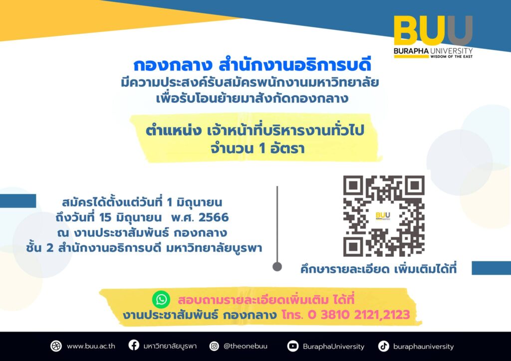 สมัครได้ตั้งแต่วันที่ 1 – 15 มิถุนายน 2566 งานประชาสัมพันธ์ กองกลาง ชั้น 2 สำนักงานอธิการบดี มหาวิทยาลัยบูรพา