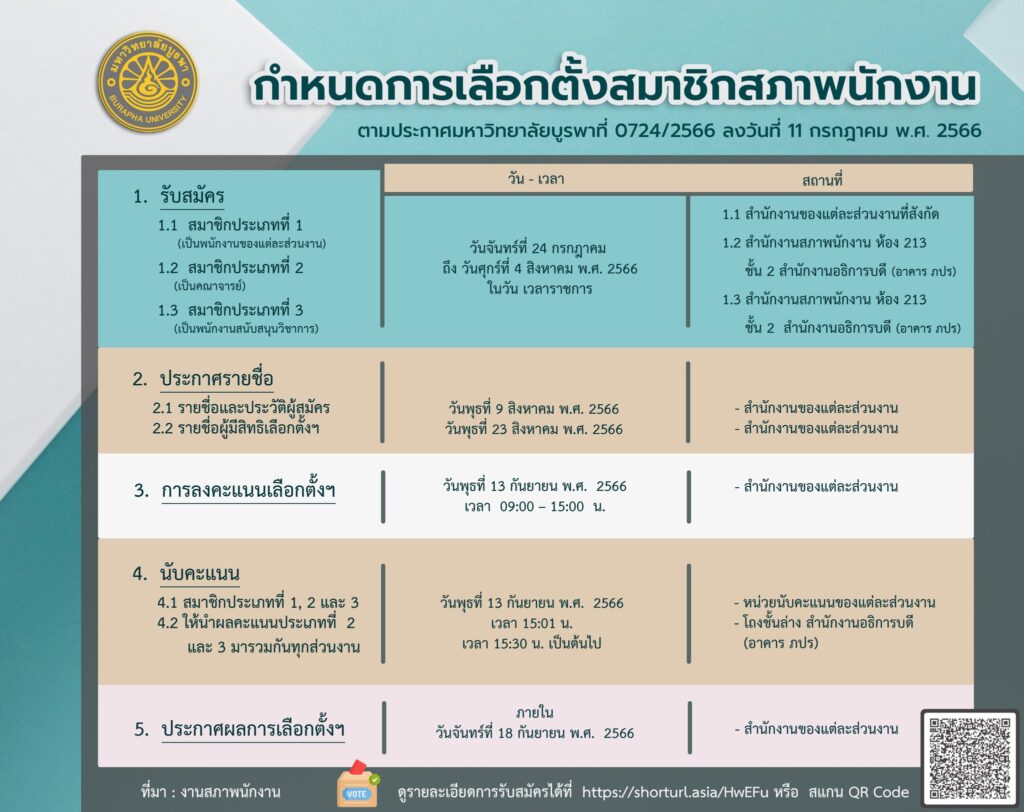 ประกาศฯ การดำเนินการเลือกตั้งฯ (0724-2566)ตามที่สมาชิกสภาพนักงานมหาวิทยาลัยบูรพา จะครบวาระการดำรงตำแหน่งในวันที่ ๒๘ กันยายน พ.ศ. ๒๕๖๖ เพื่อให้การดำเนินงานของสภาพนักงานเป็นไปอย่างต่อเนื่อง และเป็นไปตาม ข้อ ๗ ของข้อบังคับมหาวิทยาลัยบูรพา ว่าด้วยสภาพนักงาน พ.ศ. ๒๕๕๑ และที่แก้ไขเพิ่มเติม มหาวิทยาลัยจึงกำหนดให้มีการดำเนินการเลือกตั้งสมาชิกสภาพนักงาน ในวันพุธที่ ๑๓ กันยายน พ.ศ. ๒๕๖๖ (รายละเอียดเพิ่มเติม…)