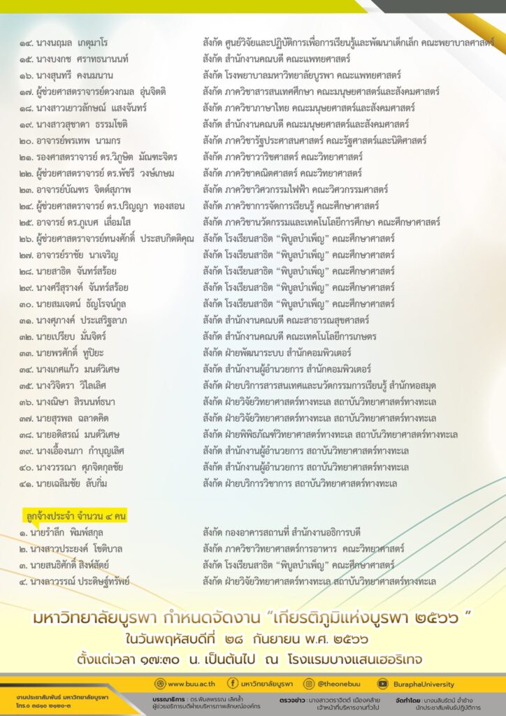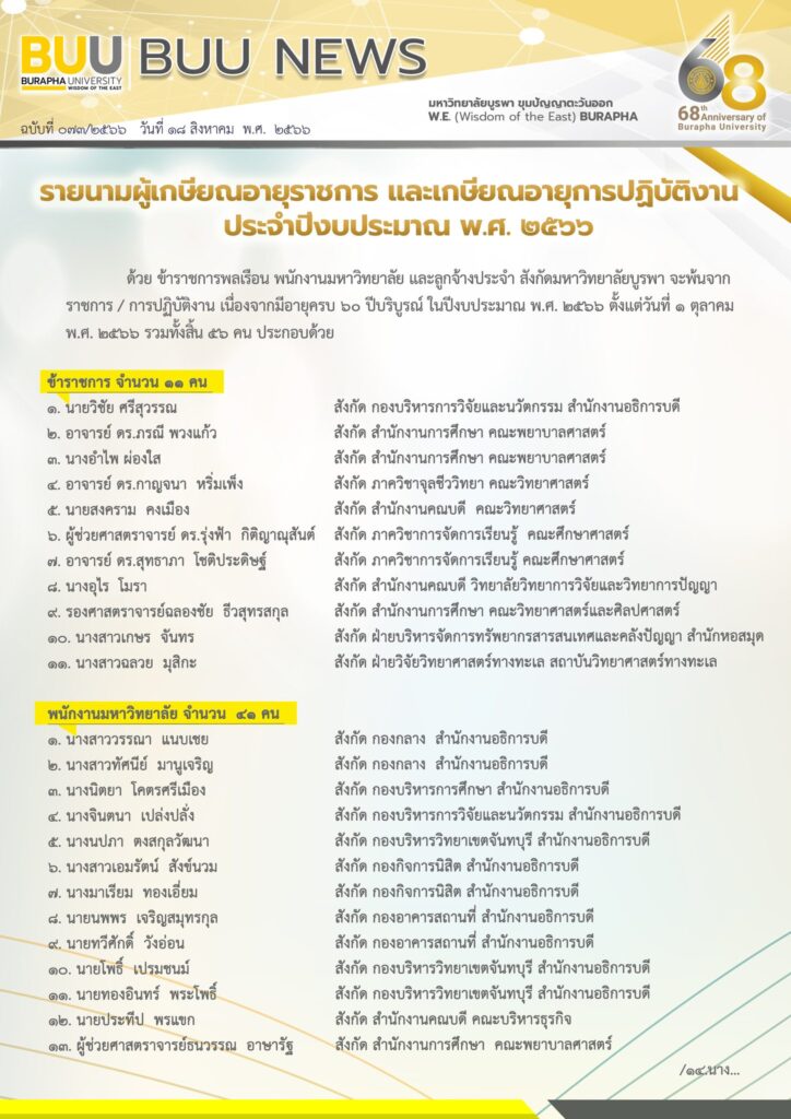 ข้าราชการพลเรือน พนักงานมหาวิทยาลัย และลูกจ้างประจำ สังกัดมหาวิทยาลัยบูรพา จะพ้นจากราชการ / การปฏิบัติงาน เนื่องจากมีอายุครบ 60 ปีบริบูรณ์ ในปีงบประมาณ พ.ศ. 2566 ตั้งแต่วันที่ 1 ตุลาคม พ.ศ. 2566 รวมทั้งสิ้น 56 คน