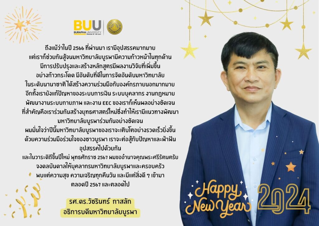 สวัสดีปีใหม่ 2567 27 ธันวาคม 2023ศิรินาฏข่าวประชาสัมพันธ์ สวัสดีปีใหม่ 2567 คณาจารย์ บุคลากร และนิสิตมหาวิทยาลัยบูรพาทุกๆท่านครับ << รศ.ดร.วัชรินทร์ กาสลัก อธิการบดีมหาวิทยาลัยบูรพา>>