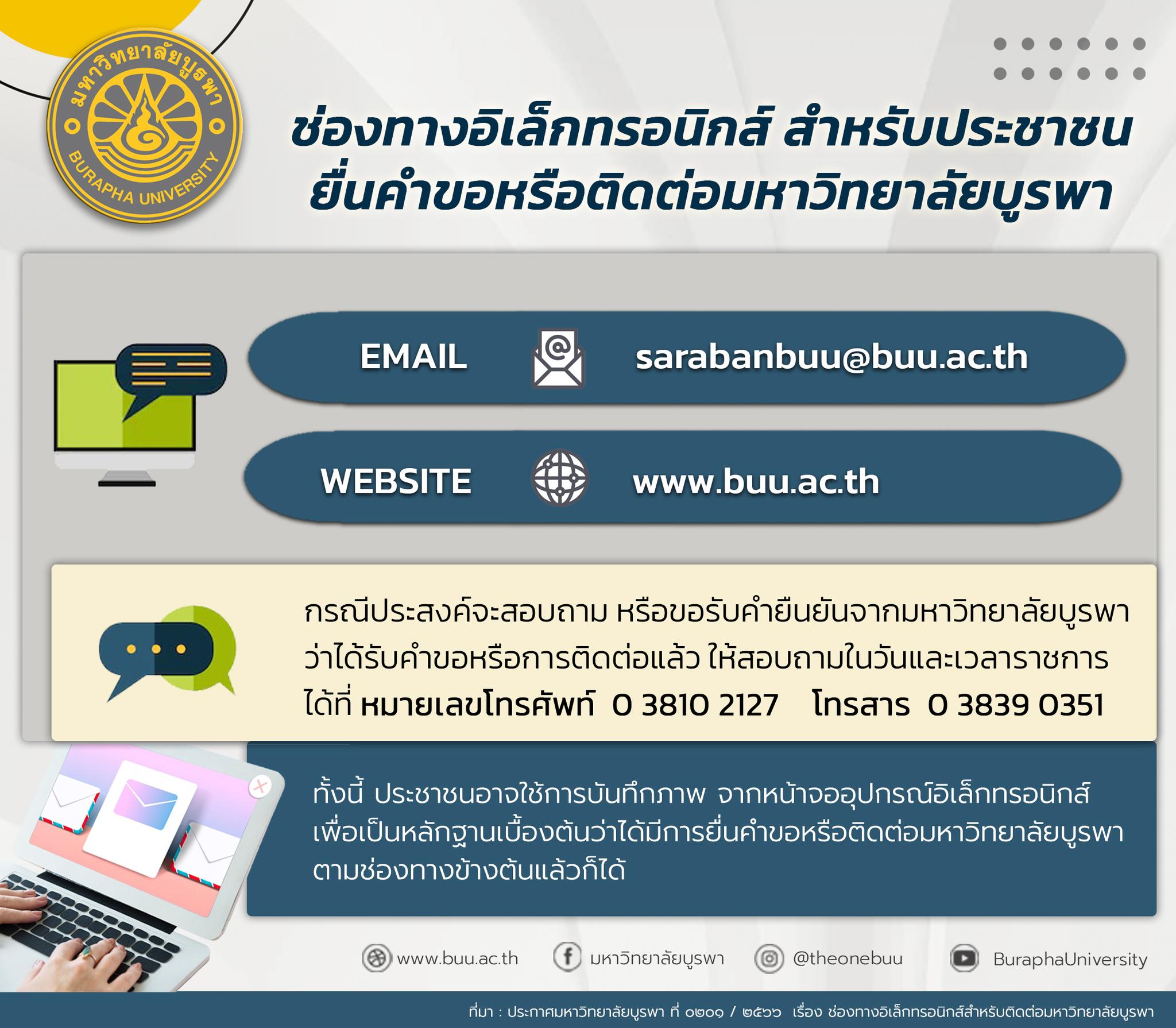 ช่องทางอิเล็กทรอนิกส์ สำหรับประชาชน ในการยื่นคำขอหรือติดต่อมหาวิทยาลัยบูรพา 2 มีนาคม 2023ศิรินาฏข่าวประชาสัมพันธ์ ช่องทางอิเล็กทรอนิกส์ สำหรับประชาชนในการยื่นคำขอหรือติดต่อมหาวิทยาลัยบูรพา